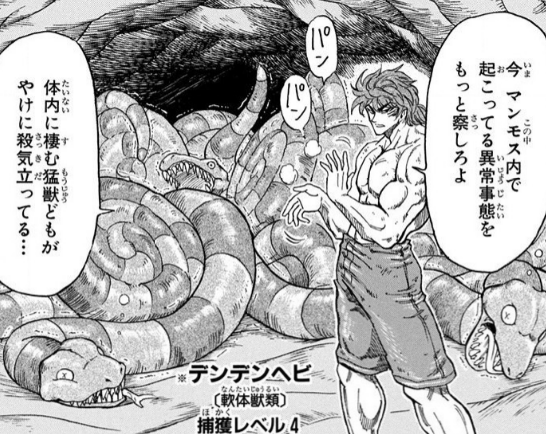 カタツムリのような殻を持つヘビ。軟体獣類。体の大きさで変わり、リーガルマンモスの体内にいた個体は捕獲レベル4だが、自然界には捕獲レベル20に近い個体も存在する。生息地は高温多湿の場所でリーガルマンモスの体内に生息していた。体長3.8m、体高2.3m... -