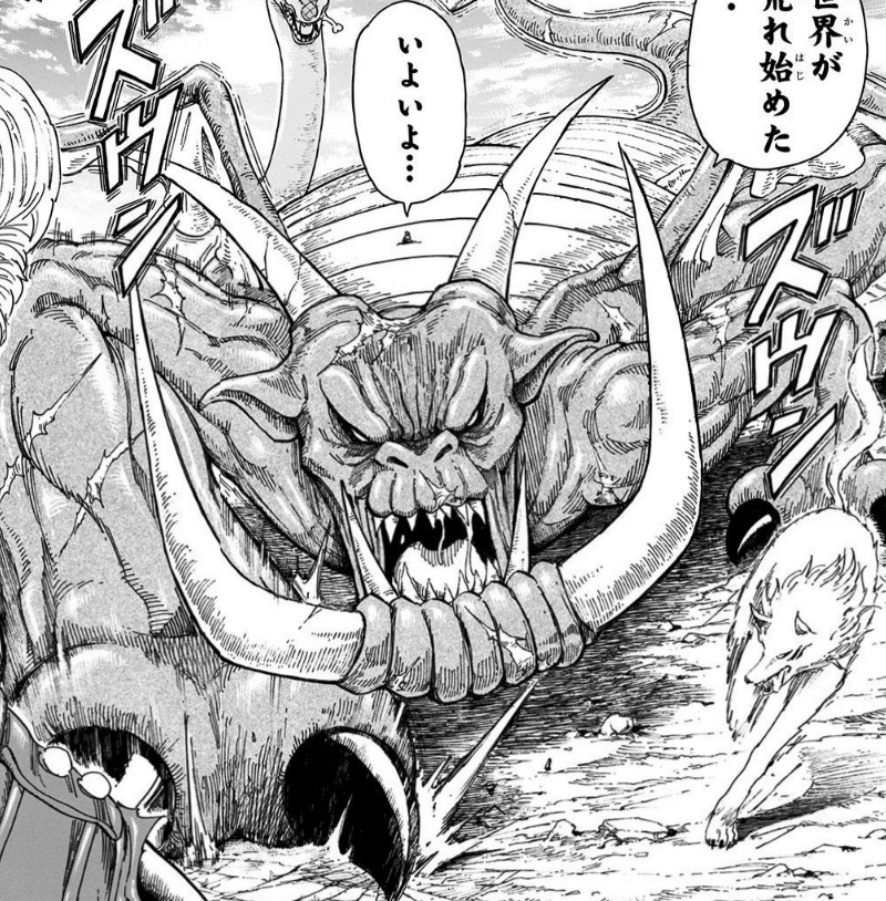 尾にハンマーを有する石殻獣類。捕獲レベルは165。生息地はグルメ界。体長90m、体高60m、体重3万t。 牙が長く伸びた顎は2tあり、硬い岩も突き刺し砕くことができる。短い羽で短距離なら飛行することも可能。非常に凶暴な性格で、尾のハンマーを振り回しな... -