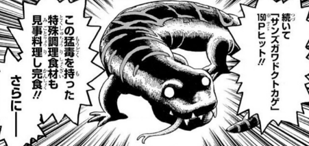 「三途の川の怪物」の異名をもつ猛毒を有するトカゲ。爬虫獣類。捕獲レベルは21。生息地は熱帯の森。体長1m、体重20kg。 性格は凶暴で、噛まれると猛毒で筋肉が溶けて死に至る。相手を三途の川へと誘う怪物であり、危険な特殊調理食材で、毒を除去するには... -