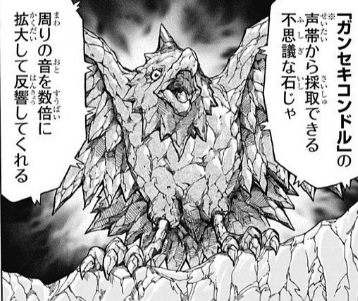 岩石が多い場所に生息する鳥獣類。捕獲レベルは27。生息地は鉱山など岩の多い場所。体長3m、体重700kg。 通常は岩肌に紛れて隠れ、獲物を捕獲する際などに岩肌から姿を現し獲物を急襲する。声帯から採取できる石は「拡音石」と呼ばれ、周りの音を数倍に拡... -