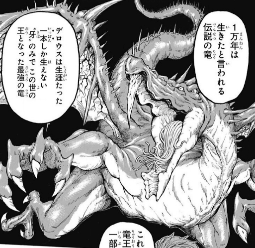 「竜王」の異名を持つ「1万年は生きた」と言われる伝説の竜。翼竜獣類。捕獲レベルは不明。生息地はエリア1。体長350m、体重150万t。 生涯たった一本しか生えない牙だけでこの世の王となった最強の竜で、以前初代メルクがデロウスの化石からその牙を採取し... -