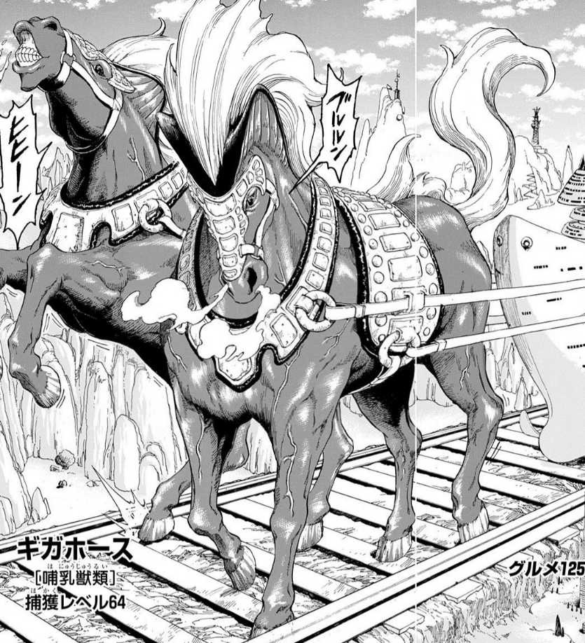 人間界一周を約2年間かけて周回する豪華客馬グルメ馬車を牽引する水陸両用の超巨大馬。哺乳獣類。捕獲レベルは64。特定の生息地はないが、希少種のため捕獲は困難。体長1000m、体高800m、体重1500万t。 世界のグルメ都市を繋ぐ巨大線路ワールドコネクト上... -