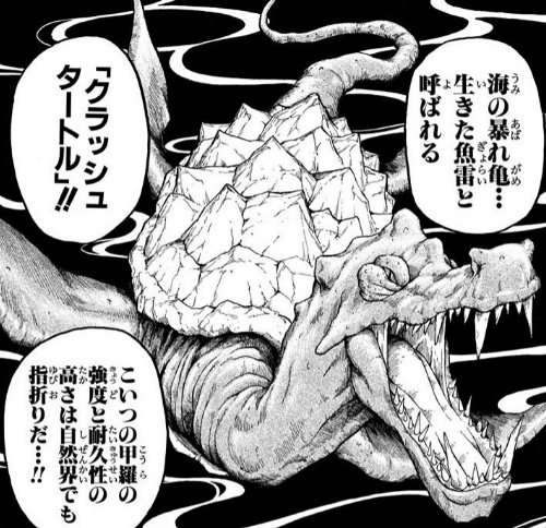 「生きた魚雷」と呼ばれる海の暴れ亀。捕獲レベルは60。 甲羅の強度と耐久性の高さは自然界でも指折り。剛性や靱性に優れ硬度も鉄の数倍で、手練の職人によって鍋やその他の調理器具にも加工されているが、捕獲レベルが高いので世にはほとんど出回らない。... -