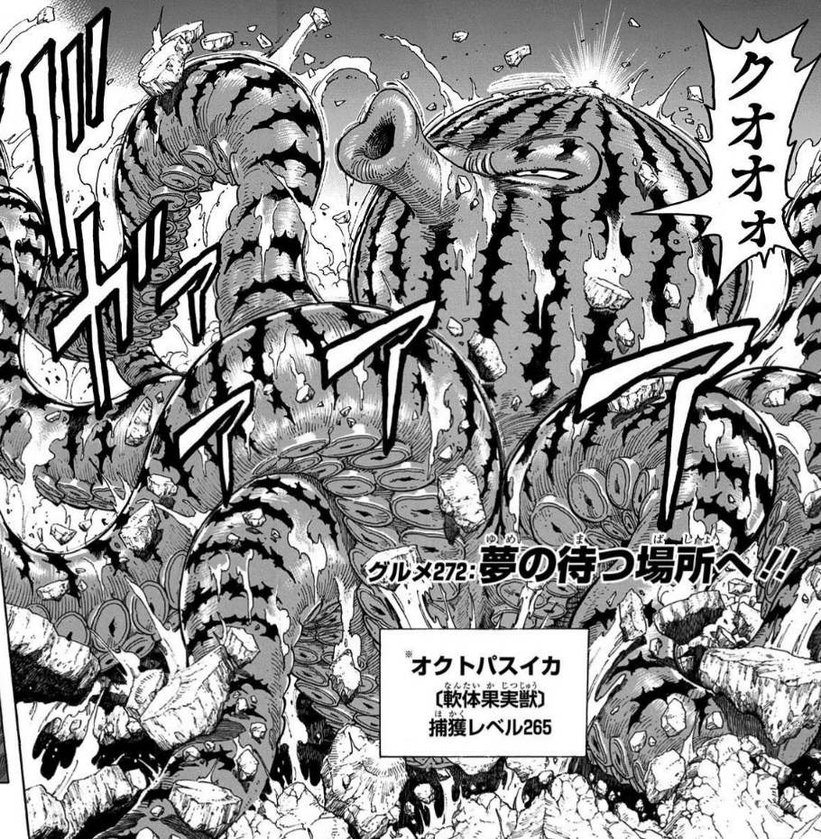 スイカの模様をした巨大タコ。軟体果実獣。捕獲レベルは265。生息地はIGO第1ビオトープ。体長3500m、体重55億t。 IGO第1ビオトープの地中に熟するまで眠っていた一龍がトリコたちのために用意したキャンピングモンスター。移動しながら住むことができる。... -