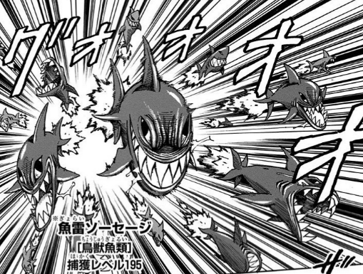 魚雷のような性質を有する魚。鳥獣魚類。捕獲レベルは195。生息地はグルメ界のユトウ島。体長35m、体重350t。 普段は集団で行動し、外側の皮膚は鋼鉄のように強固で、触ると爆発する。咬合力もクインの体を噛みちぎるほど。 爆破しないようにエラから高度... -