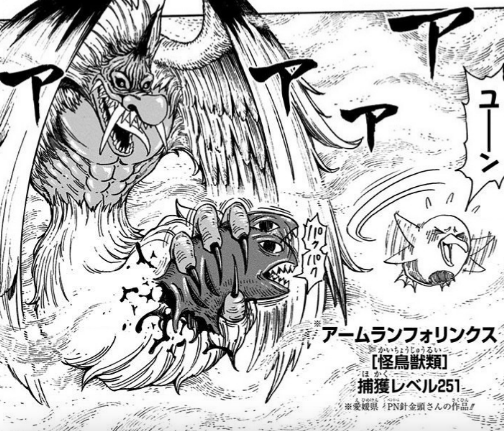 下半身が巨大な腕となっている怪鳥。怪鳥獣類。捕獲レベルは251。生息地はグルメ界のユトウ島。体長60m、体重700t。 見た目に違わず性格は凶暴。剛腕の爪に猛毒をもち、獲物をしっかり捕えて放すことはない。遠くまで見渡せる千里眼を有し、その能力で獲物... -